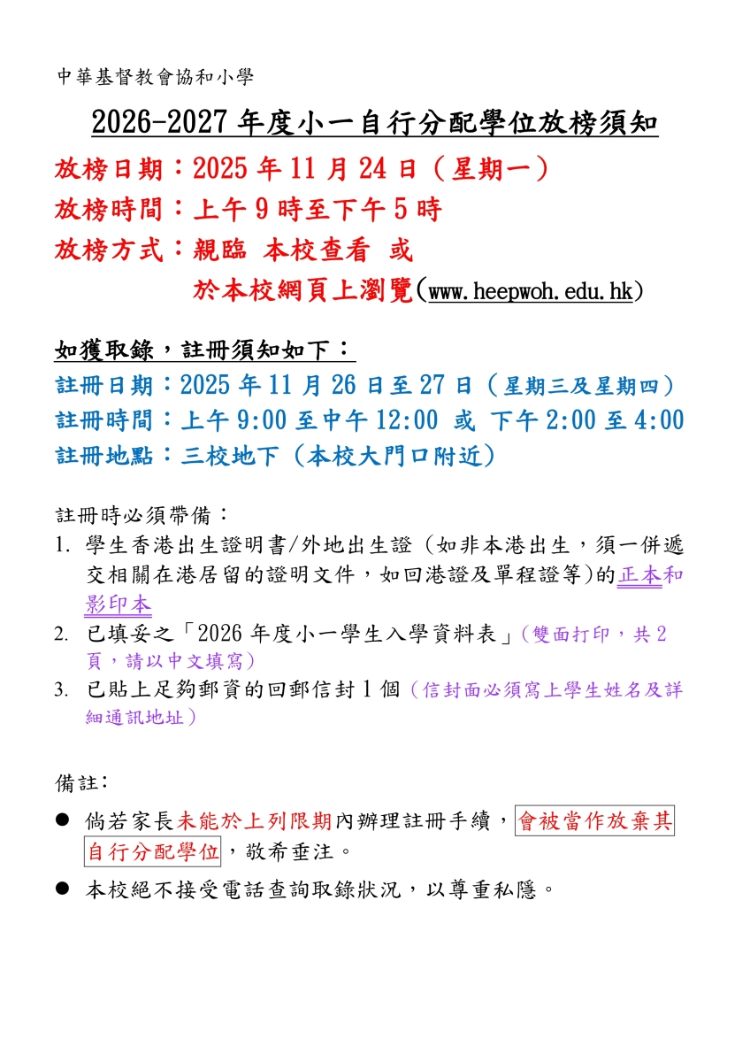 2026-2027年度小一自行分配學位放榜須知